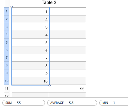 Select the cells and at the bottom of the Numbers window youll see each of those common formulas display automatically. Once you create a formula you can copy it to other cells instead of typing it over and over. The result of the formula appears at the end of your selection.